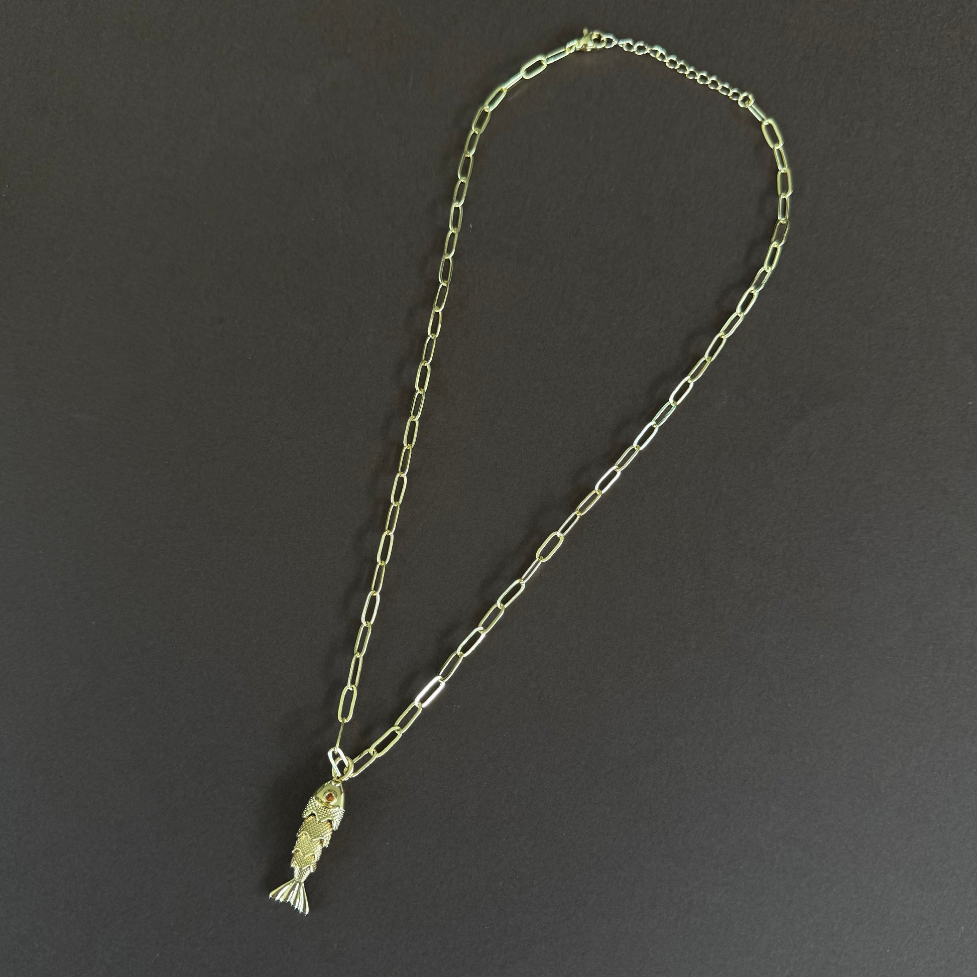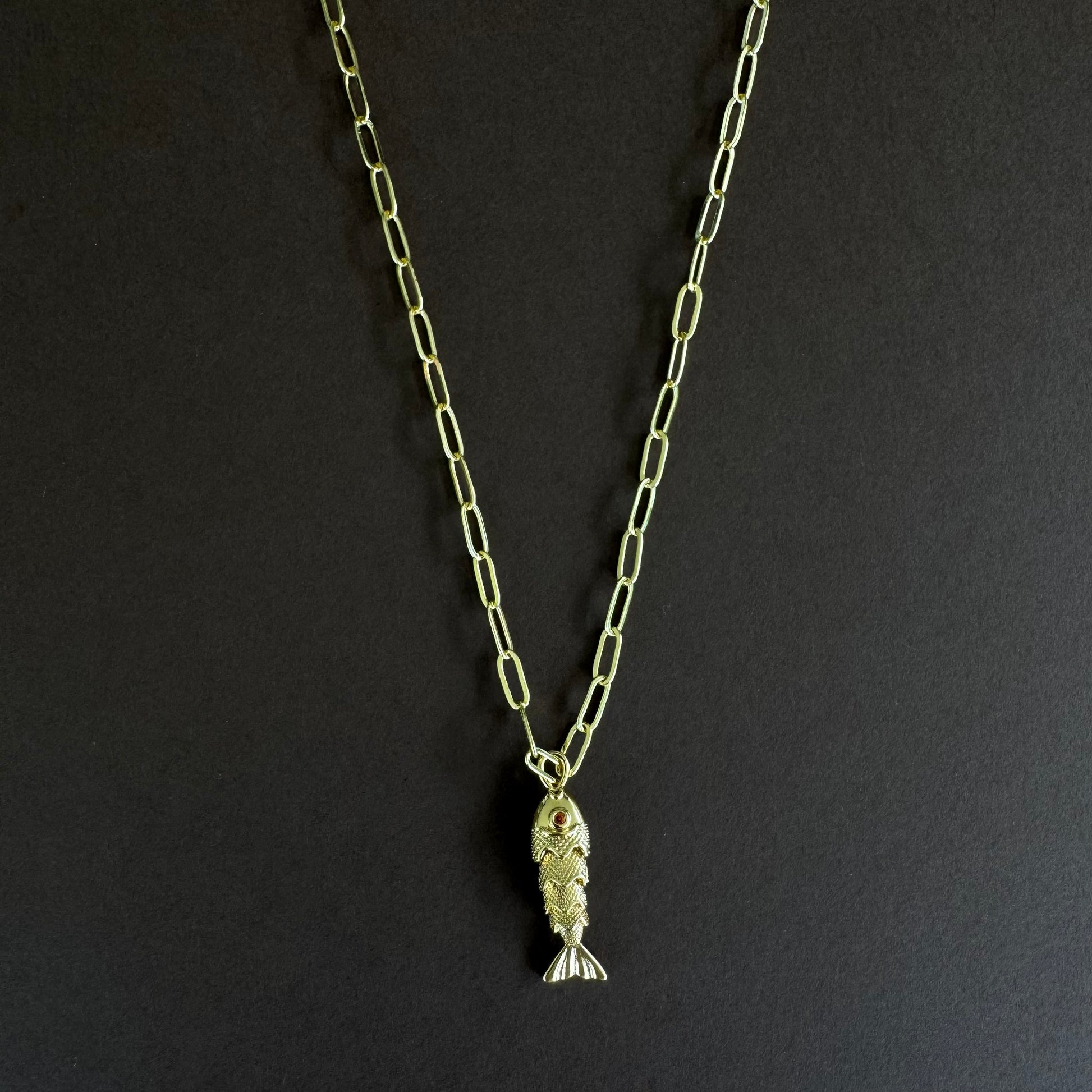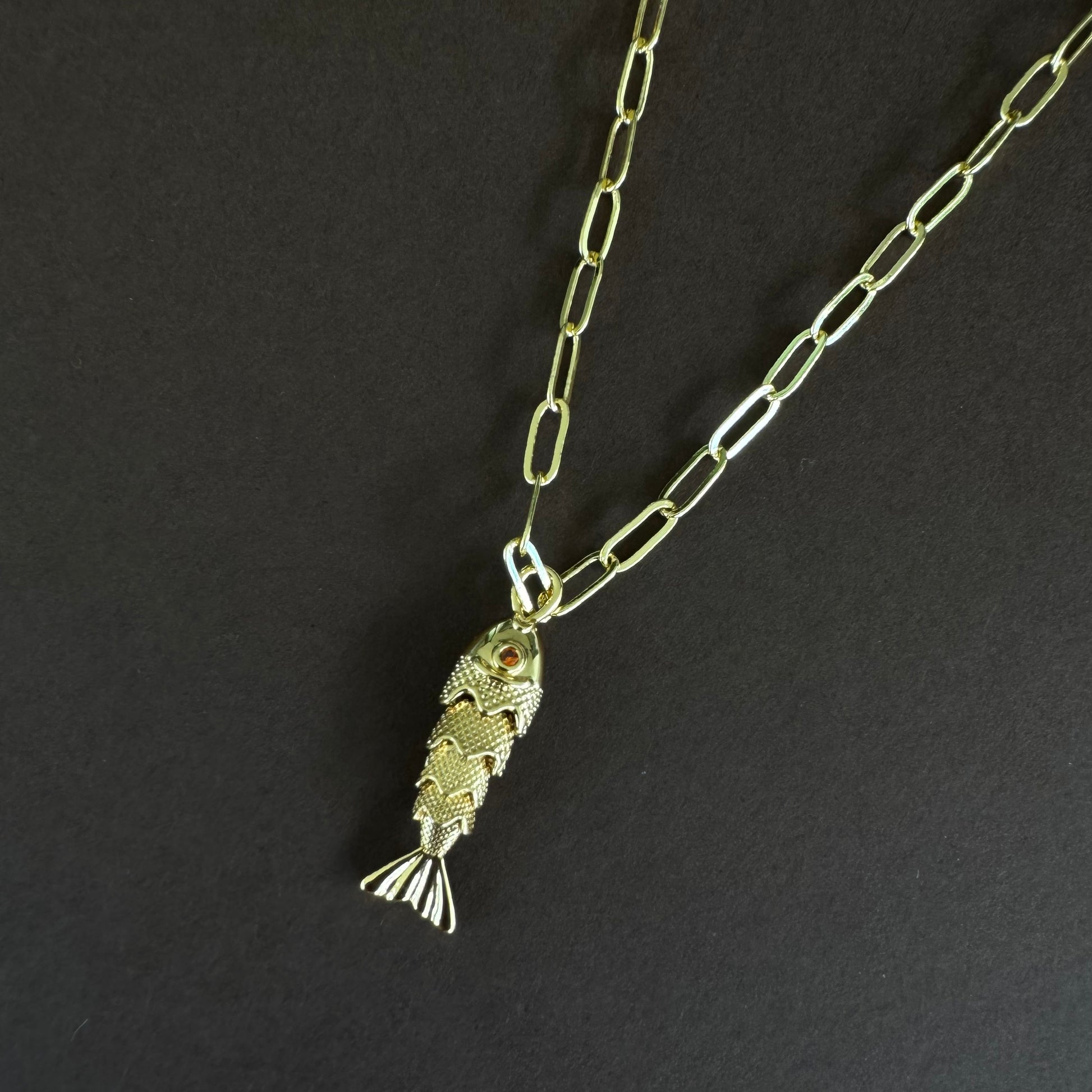 El charm Ondina representa la fluidez, la abundancia y la intuición. Diseñado en forma de pez de 2.5 cm de largo, su cuerpo articulado permite un movimiento sutil que da vida a la pieza, mientras un cristal naranja en su ojo simboliza la energía vital y la prosperidad.