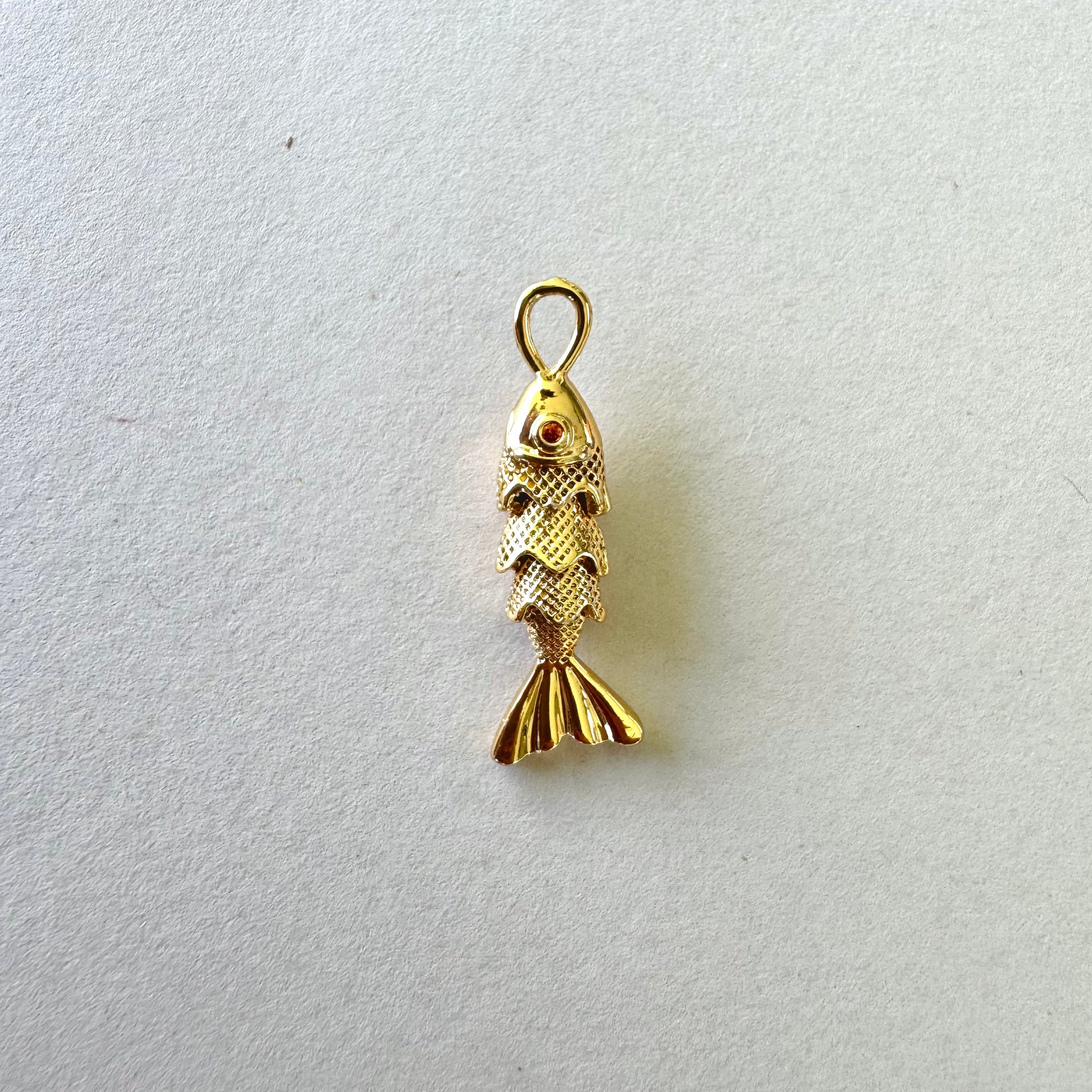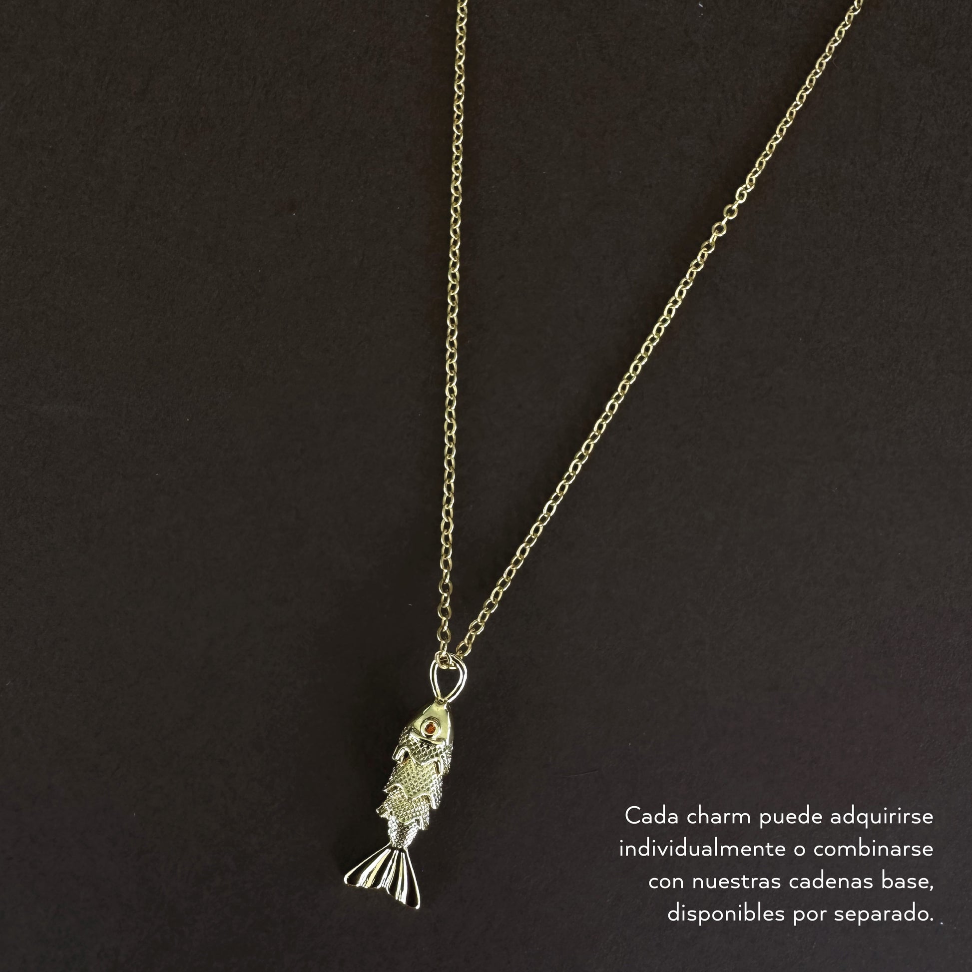 Este charm representa la fluidez, la abundancia y la intuición. Diseñado en forma de pez de 2.5 cm de largo, su cuerpo articulado permite un movimiento sutil que da vida a la pieza, mientras un cristal naranja en su ojo simboliza la energía vital y la prosperidad.
