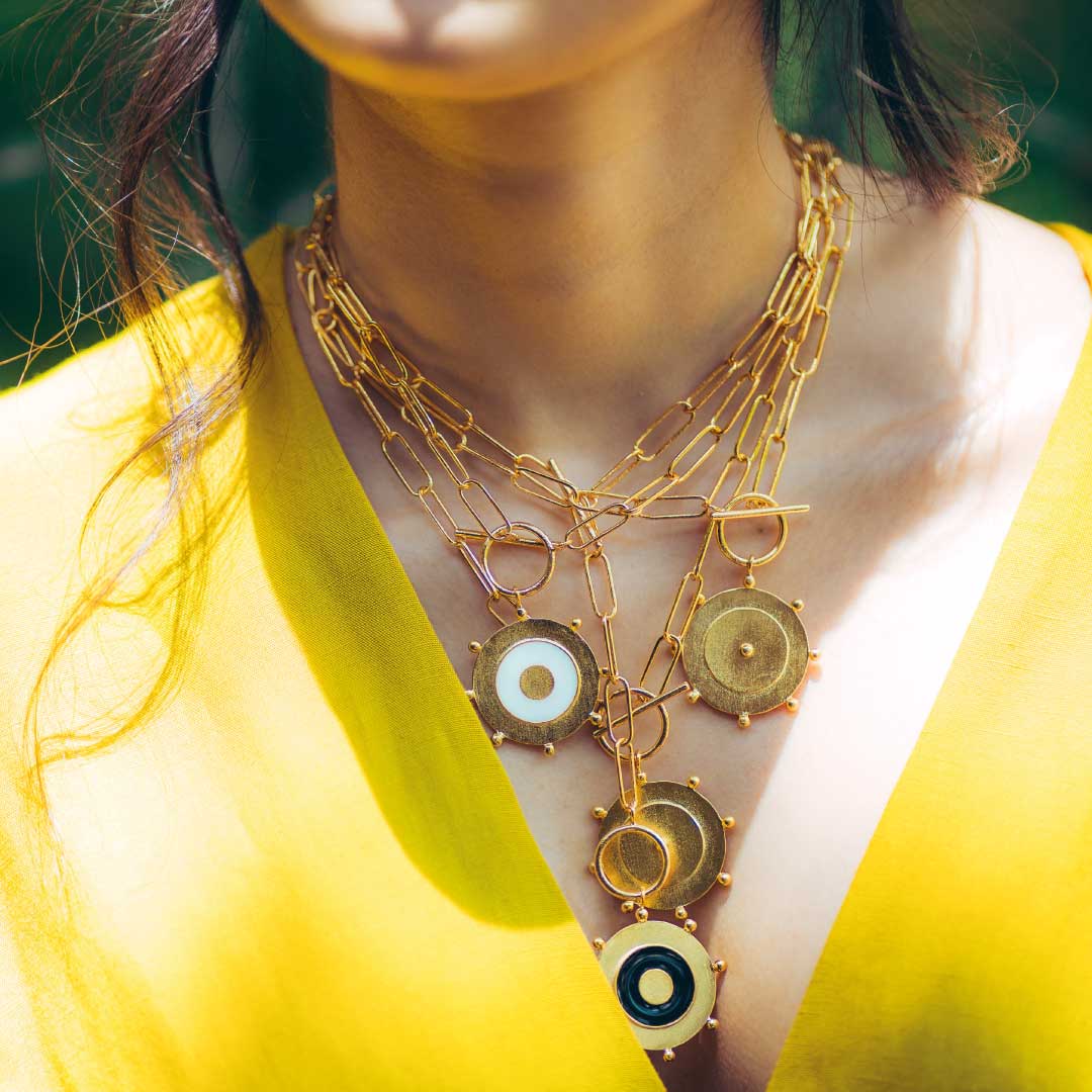 Material: Bronce, baño en oro de 24k, esmaltes de colores.