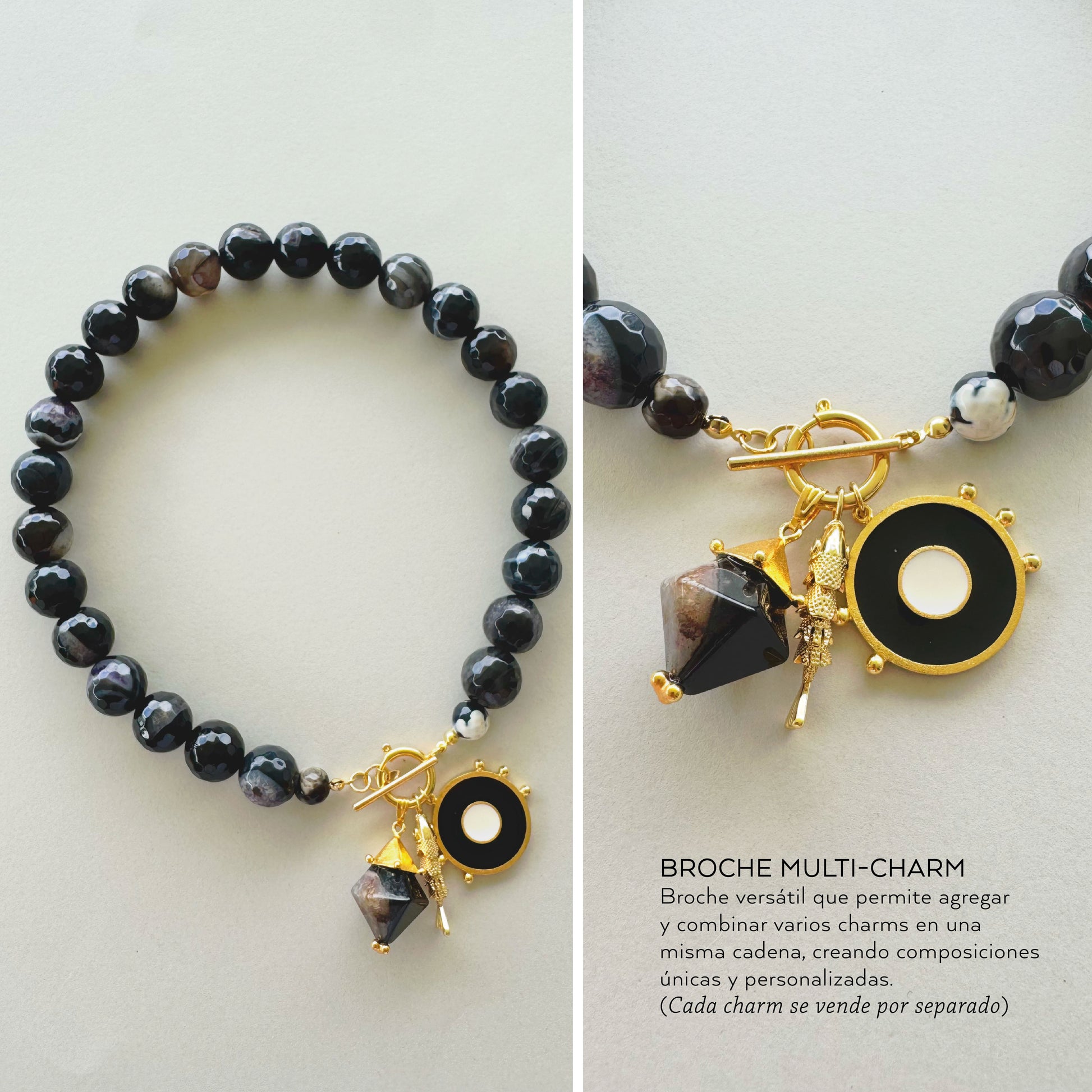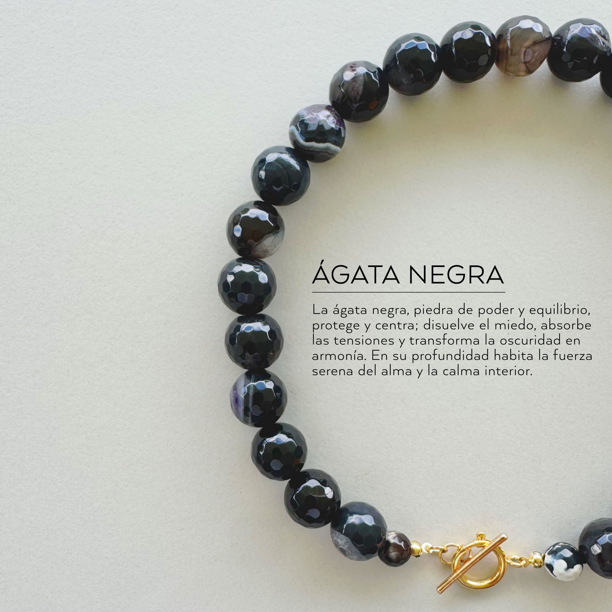Este colar está elaborado con ágatas negras de 16 mm. De 45 cm de longitud, incorpora un broche tipo T multicharm que permite personalizarlo con dijes y amuletos. Puede usarse con el broche al frente, como punto focal lleno de intención, o hacia atrás, dejando que las piedras expresen su poder silencioso.