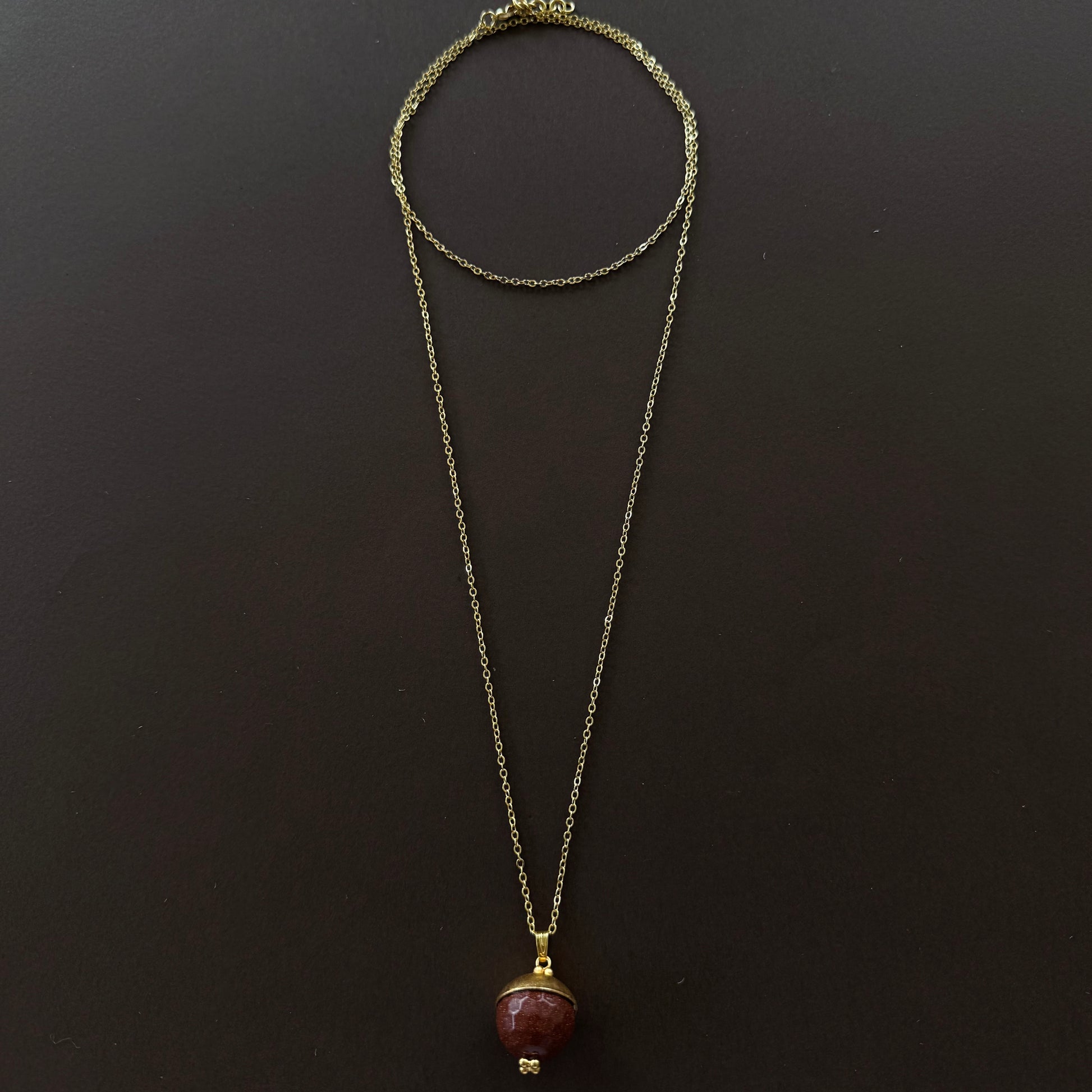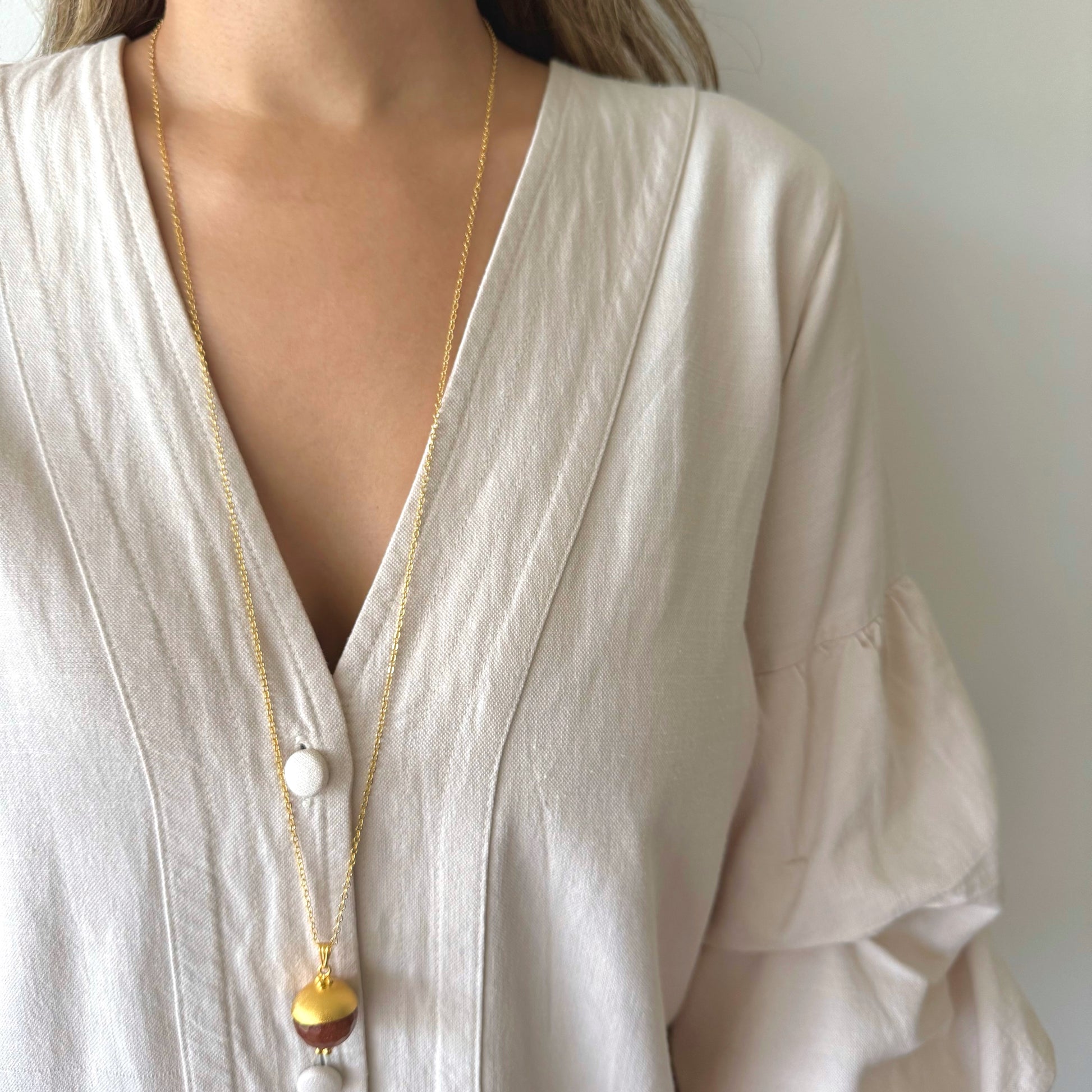 Este collar une la fuerza simbólica del Charm Copper Dust con la delicadeza de una cadena Slim larga de 85 cm, creando una pieza elegante, versátil y llena de intención. Su diseño alargado aporta un toque contemporáneo y estilizado, ideal para llevar sola o como parte de un layering sofisticado. A esta cadena se le pueden dar hasta dos vueltas. El Charm Copper Dust, elaborado en piedra Lluvia de Estrellas con herraje en bronce bañado en oro de 24k, se distingue por su forma circular facetada, que captura la luz como un pequeño universo suspendido.